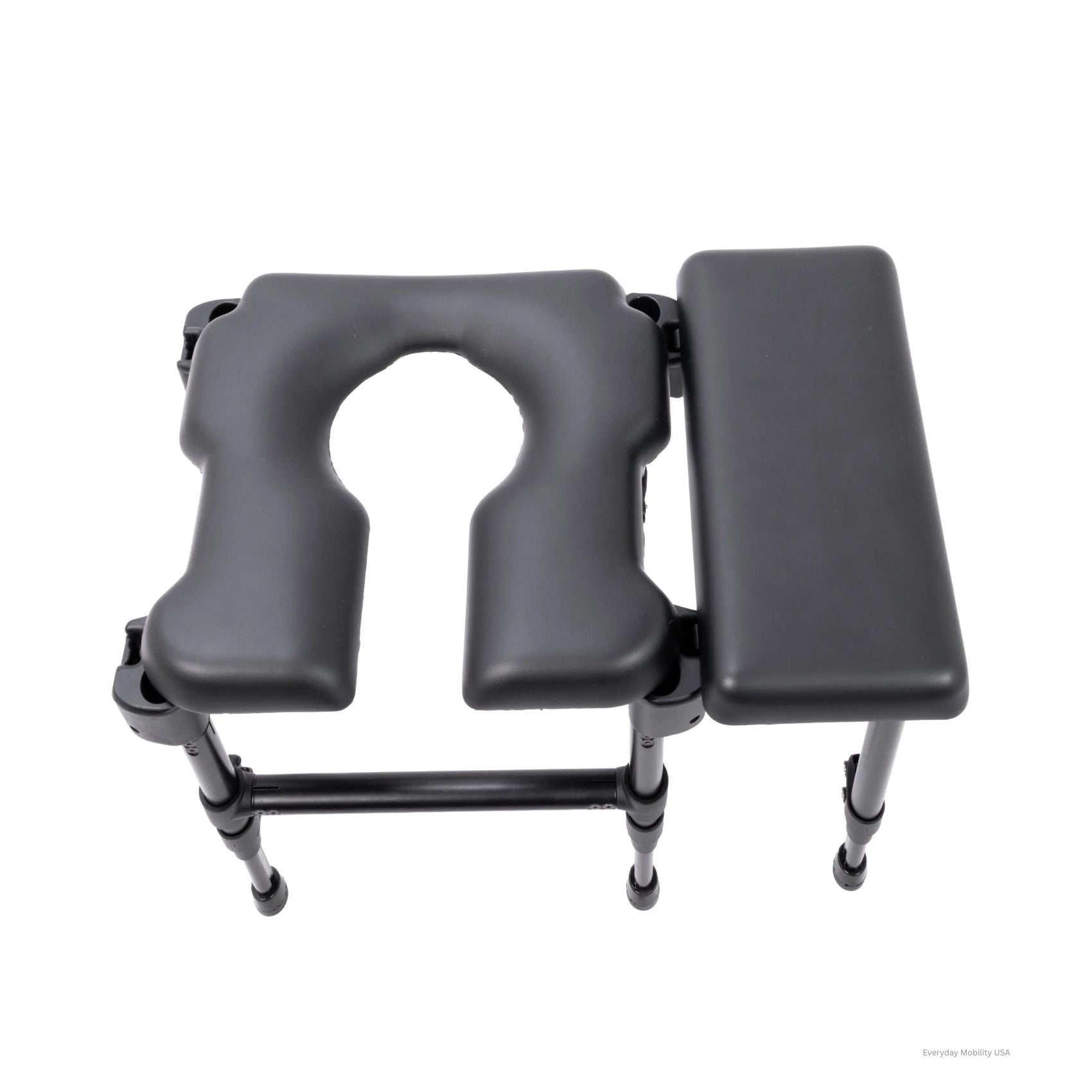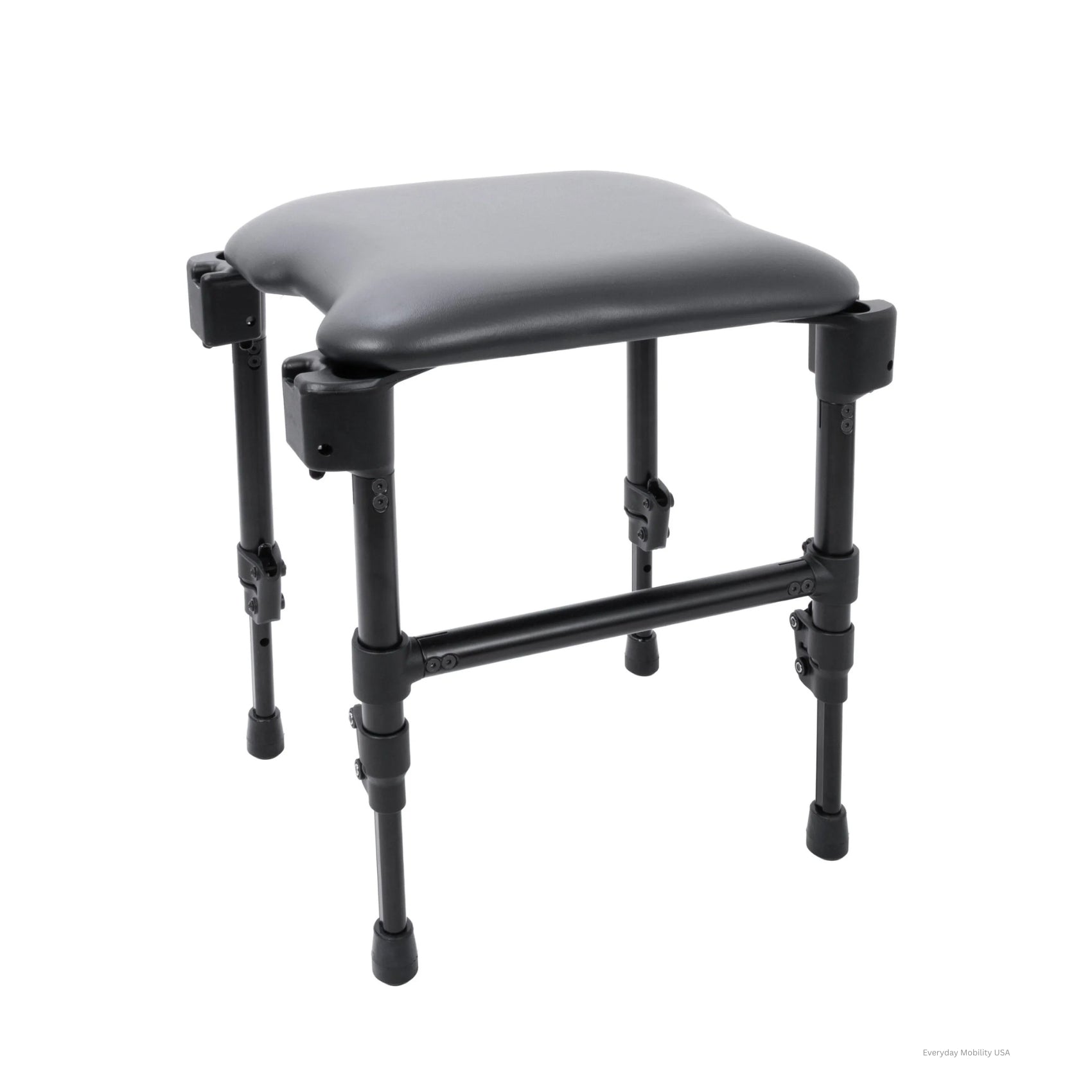The contoured seat features a cut-out that can be ordered with front, rear, or side opening and is available with molded foam or gel options. A solid seat is available for showering when bathing is the primary use. Independent, height-adjustable chair and bench legs help maintain a level seating surface in the shower or when bridging a tub ledge.