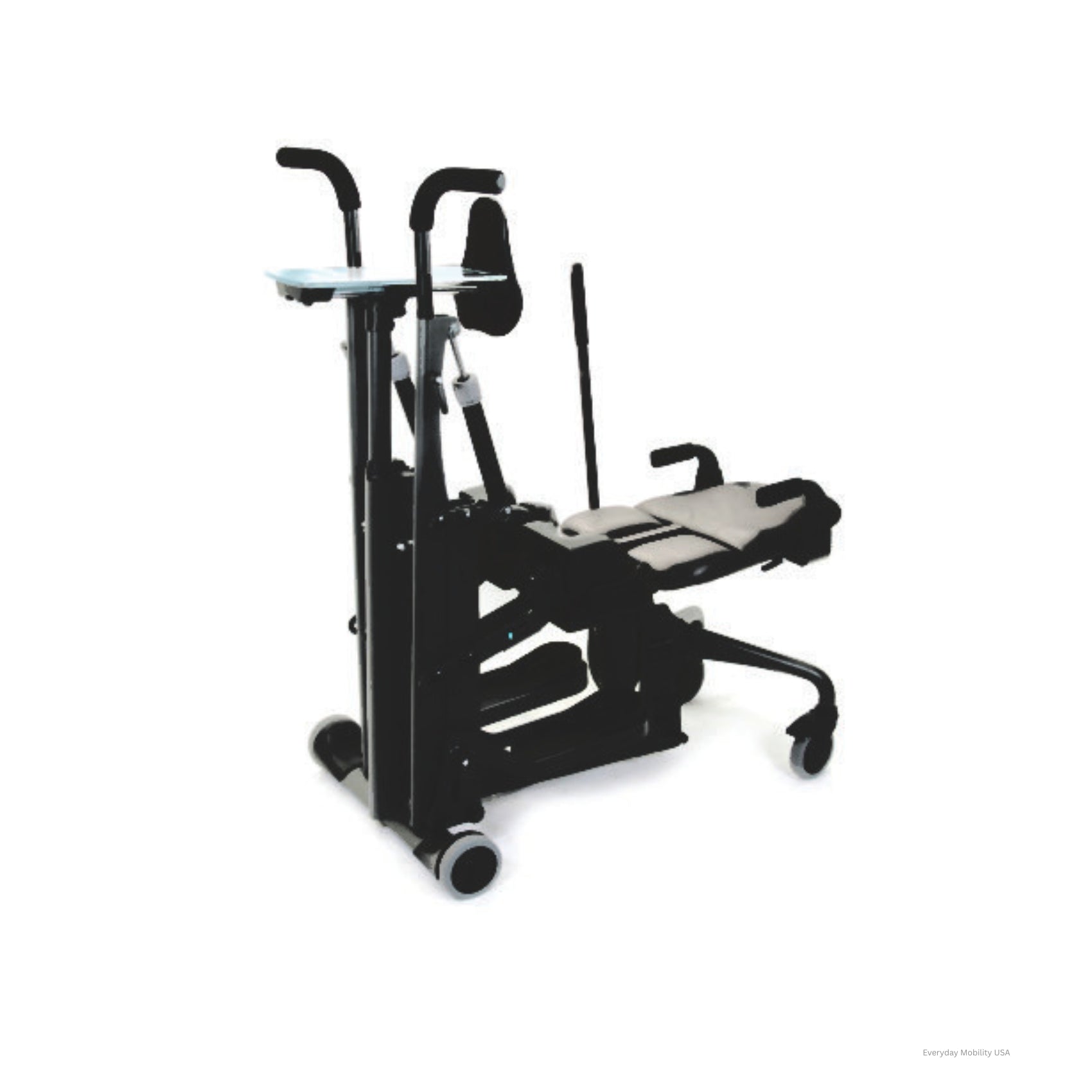 Active standing provides lower body range of motion and upper body strengthening. Unlike passive standers, users move the handles with their arms (or a caregiver can assist) which creates a reciprocal movement in the legs. The full range seat has hinged, break-away sections for each leg that allow full leg extension while standing. This advanced stander enhances the medical benefits of standing and keeps the body in shape for medical breakthroughs. Numerous research studies suggest that use of an active standing frame can positively affect an individual’s health.
