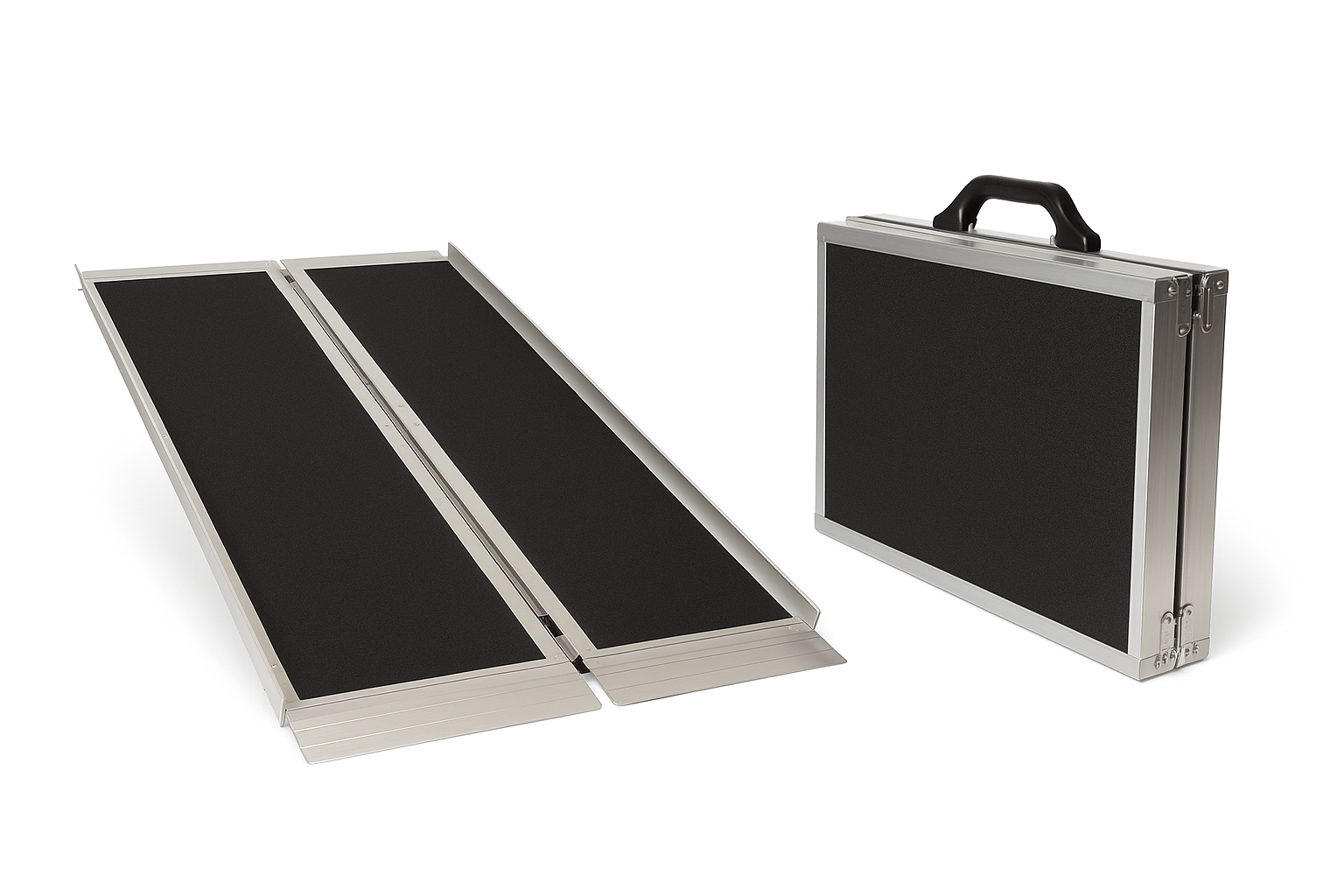 The Everyday Mobility USA Pontchartrain Multifold Ramp is engineered for scooters and wheelchairs of all types. With a full 36” width, rugged welded construction, and an 800-lb weight capacity, it delivers the balance of strength and portability. The patented hinge prevents pinch points, while the built-in slope indicator provides a quick safety check before every use. Ideal for home, travel, or facility applications.